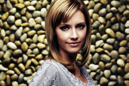 पत्थरों की पृष्ठभूमि पर एक स्वेटर में एक महिला