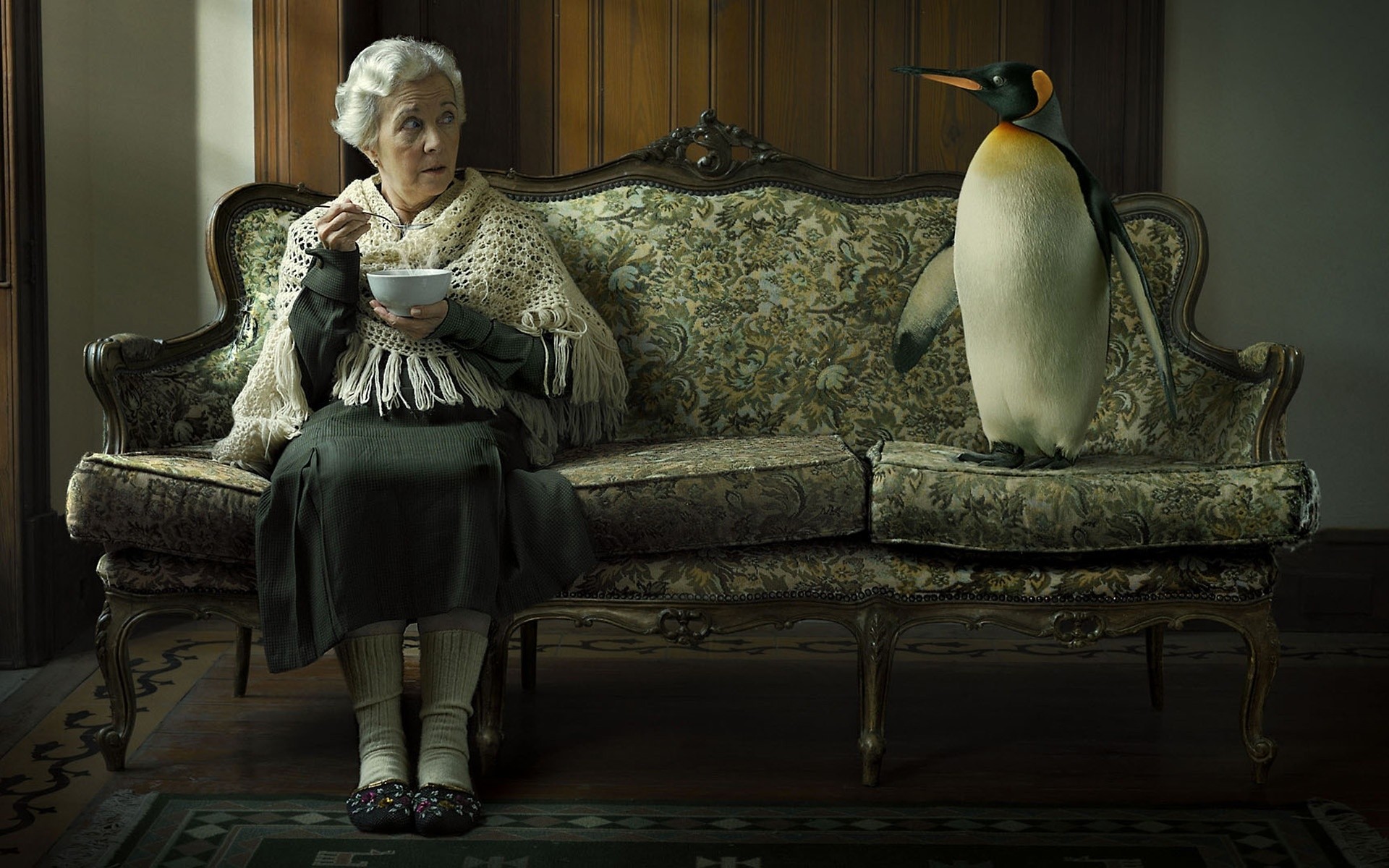 दादी के साथ एक पेंगुइन खाती सूप सोफे पर