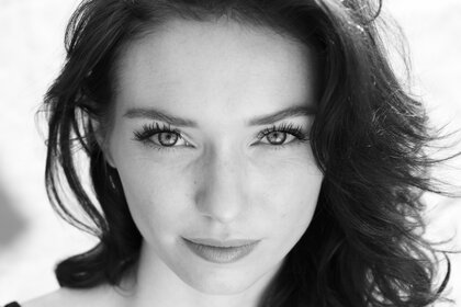 काले और सफेद पृष्ठभूमि पर लंबी पलकों वाली लड़की