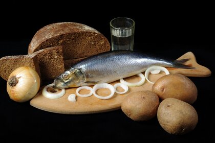 रूसी दावत। हेरिंग, वोदका, काली राई की रोटी, प्याज, आलू