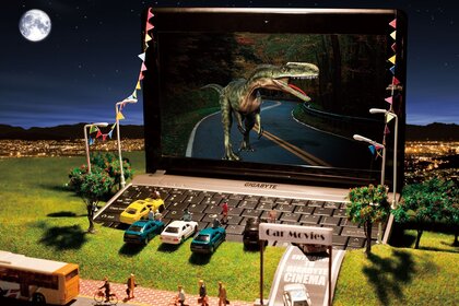 एक स्ट्रीट सिनेमा की स्क्रीन पर डायनासोर