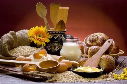 मेज पर रोटी उत्पादों और अनाज