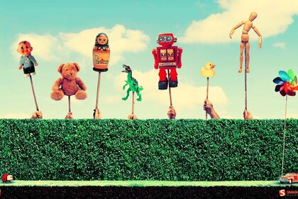 बाड़ पर लाठी पर विभिन्न खिलौने