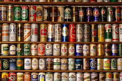 शेल्फ पर बीयर की बोतलों की एक पंक्ति