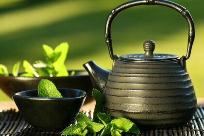 हरियाली की पृष्ठभूमि के खिलाफ मेज पर सिरेमिक चायदानी