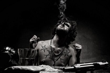 सितारों के टैटू के साथ एक धूम्रपान आदमी का पोर्ट्रेट