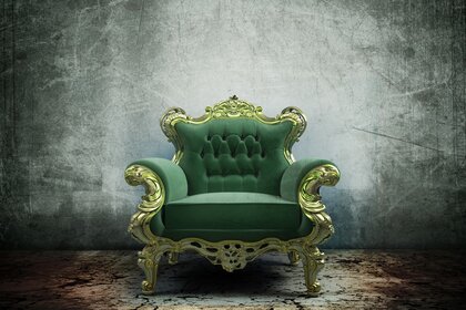 एक ग्रे दीवार के खिलाफ विंटेज ग्रीन आर्मचेयर