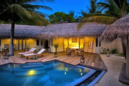 एक स्विमिंग पूल के साथ एक बंगले का आंगन