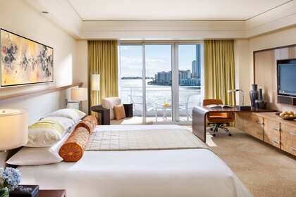 खिड़कियों के साथ बेडरूम जो नदी को देखते हैं
