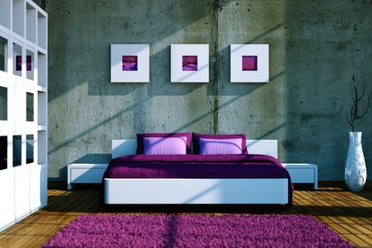 गुलाबी फर्नीचर के साथ होटल का कमरा