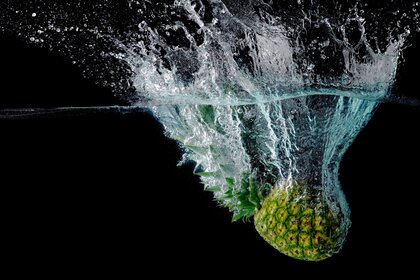 अनानास साफ पानी की पृष्ठभूमि में गिरता है
