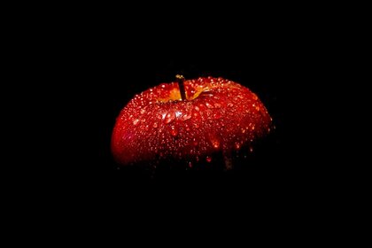 डार्क बैकग्राउंड। लाल सेब। एक सेब पर बूंदें