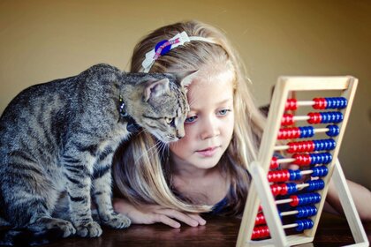 एक बिल्ली के साथ एक लड़की गणित की समस्याओं को हल कर रही है
