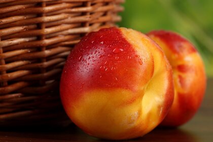 एक विकर टोकरी की पृष्ठभूमि पर पानी की बूंदों के साथ रसदार अमृत