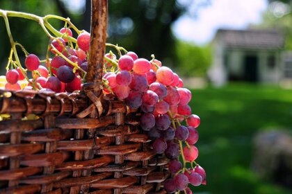 लकड़ी की टोकरी में बकाइन अंगूर का एक गुच्छा