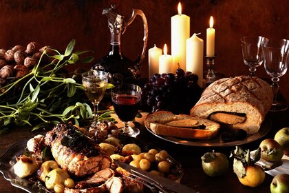 भोजन और नट्स के साथ अभी भी जीवन मोमबत्तियाँ