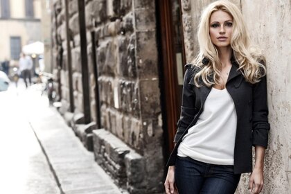 सुनहरे बालों वाली लड़की स्टाइलिश कपड़े में