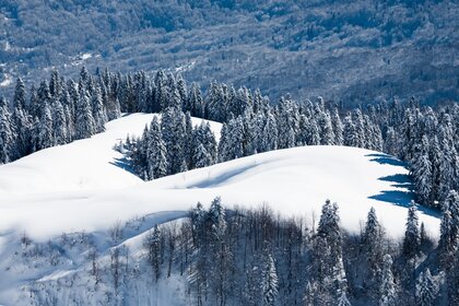 एक पहाड़ी पर बर्फीले जंगल का पैनोरमा