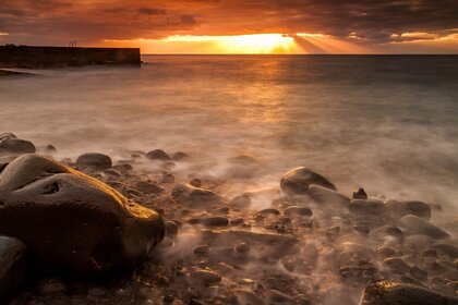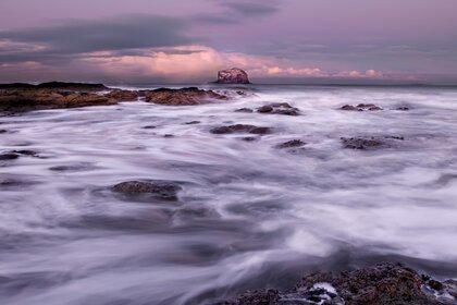 क्षितिज पर एक द्वीप के साथ समुद्र तट की तस्वीर