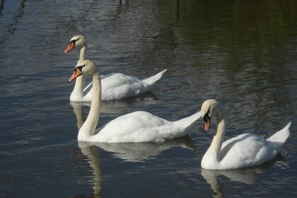 झील पर तीन सफेद हंस तैरते हैं