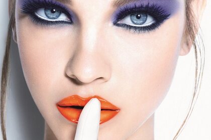 उसके होठों पर उज्ज्वल लिपस्टिक के साथ ग्लैमरस लड़की