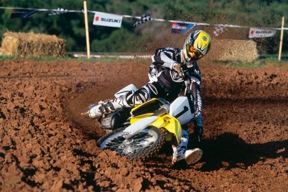 एक मोटर साइकिल चालक रेत पर प्रतियोगिताओं में भाग लेता है