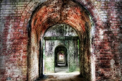 एक पुराने लाल ईंट के घर के धनुषाकार मेहराब के माध्यम से