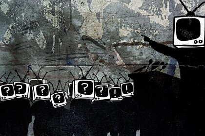 एक ग्रे कंक्रीट की दीवार पर भित्तिचित्र सिर के बजाय टीवी वाले लोगों को दर्शाते हैं