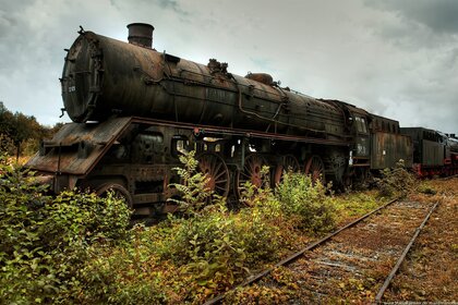 एक मैदान में रेल पर एक परित्यक्त ट्रेन