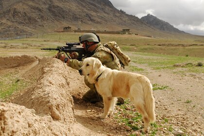 एक कुत्ते के साथ रेगिस्तान में एक सैनिक