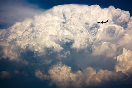 एक विशाल बादल की पृष्ठभूमि पर एक छोटा विमान