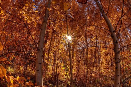सूरज पूरे पतझड़ के जंगल में फैल गया है