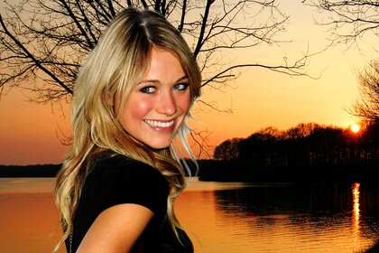 नदी की पृष्ठभूमि पर मुस्कुराती हुई लड़की