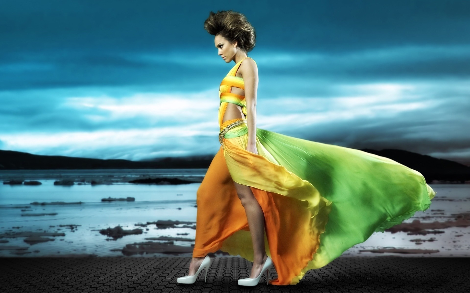 समुद्र तट पर उज्ज्वल कपड़े में एक महिला - अपने फोन के लिए वॉलपेपर
