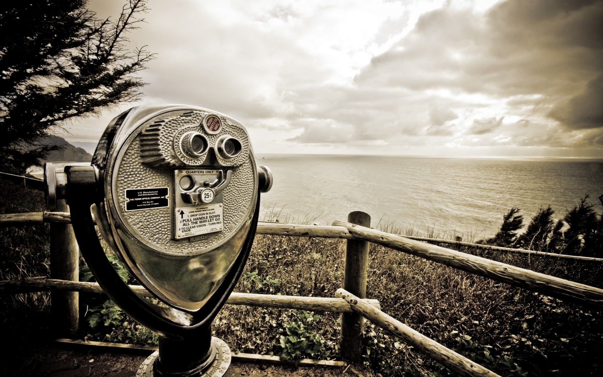 बाड़ पर दूरबीन के साथ समुद्र की मोनोक्रोम तस्वीर - अपने फोन के लिए वॉलपेपर