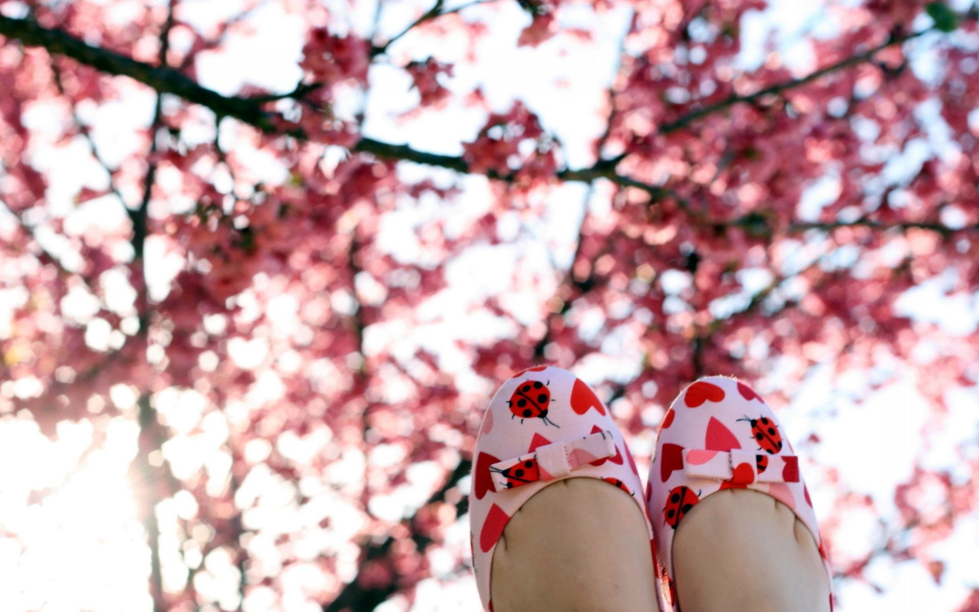 पैर चेरी फूल की एक पृष्ठभूमि पर जूते में उठाया - अपने फोन के लिए वॉलपेपर