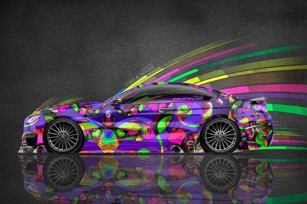 काले पहियों के साथ इंद्रधनुष कार