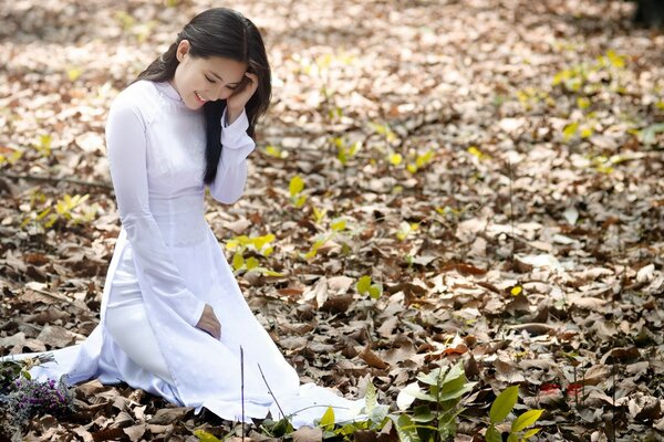 सफेद में एक लड़की शरद ऋतु के पत्तों पर बैठी है